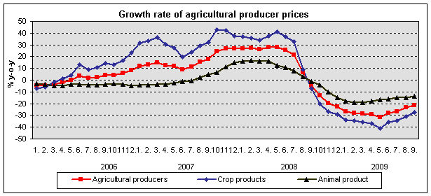 Compared to Q2 2009, agricultural producer prices fell by 4.5% in Q3 2009. Prices of crop products