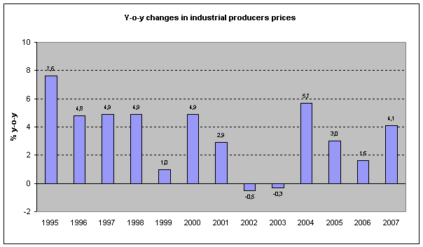 Industrial producer prices grew by 4.1% on average in 2007, which was the highest figure in last three years. The growth was affected especially by higher prices of ‘electrical energy, gas, steam and water‘ (+7.4%; production and distribution services of electricity up by 9.2%) and ‘basic metals and fabricated metal products’ (+6.7%; basic iron and steel and ferro-alloys up by 9.2%, tubes and tube fittings of cast iron by 13.3%). A significant contribution to the higher price level was the increase in prices of ‘food products’ (+4.4%), mainly due to the high growth of 9.3% on average in Q4 2007. Marked increases were recorded for the prices of ‘grain mill products, starches and starch products’ (+17.7%), ‘prepared animal feeds’ (+15.8%), ‘dairy products’ (+7.0%) and ‘other food products’ (+4.0%). The same trend as in ‘food products’ was observed in ‘coke, refined petroleum products’ (+4.4% as well); the prices were up especially in Q4 2007 (+21.1%). The only decrease was recorded for the prices of ‘transport equipment’ (-1.1%).