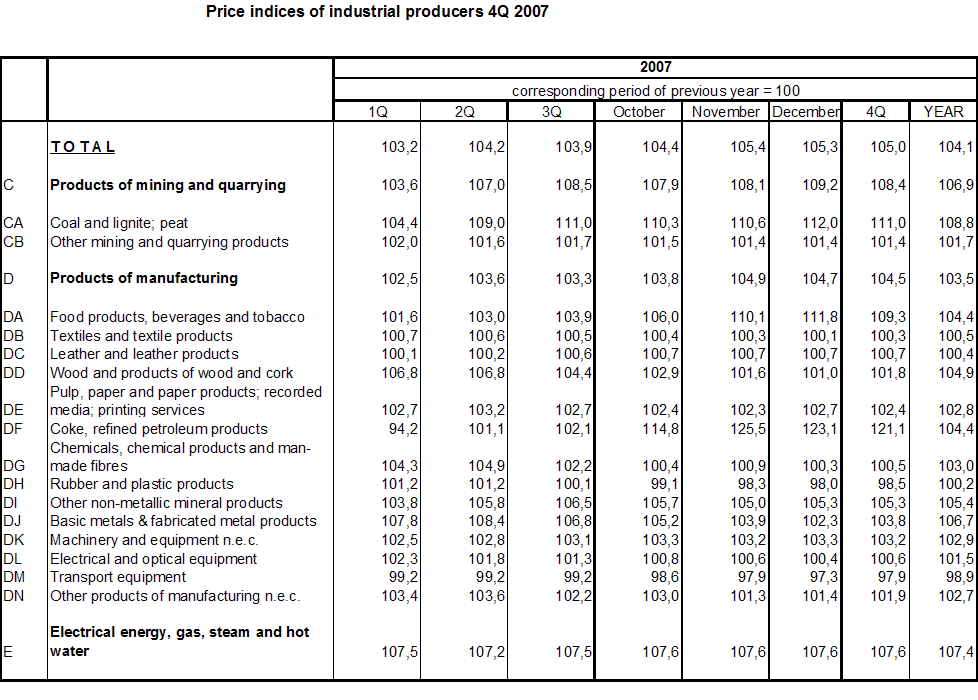 Industrial producer prices grew by 0.8% in Q4 2007 in comparison to Q3 2007. The highest increases were observed in ‘coke, refined petroleum products’ (+6.6%) and ‘food products’ (+5.2%). Prices decreased the most in ‘transport equipment’ (-1.6%), ‘chemicals, chemical products and man-made fibres’ (-1.4%) and ‘basic metals and fabricated metal products’ (-1.3%).