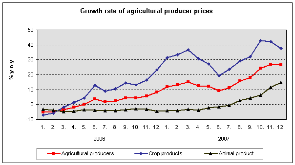 Year-on-year, agricultural producer prices were by 26.1% higher in Q4 2007 (in Q3 2007 by 15.0%). The growth was affected by prices of crop products which were up by 41.2%; prices of animal products grew by 10.8%. Higher prices of crop products were mainly due to the prices of cereals (+69.9%). Price increases were registered for fruit (+73.0%, apples), oil plants (+36.2%) and vegetables (+11.2%). Potato prices fell (-28.4%). The price increase of animal products was affected by higher prices of eggs (+27.4%), poultry (+22.2%) and milk (+20.7%). Prices of pigs (-8.2%) and cattle (-2.9%) for slaughter decreased.
