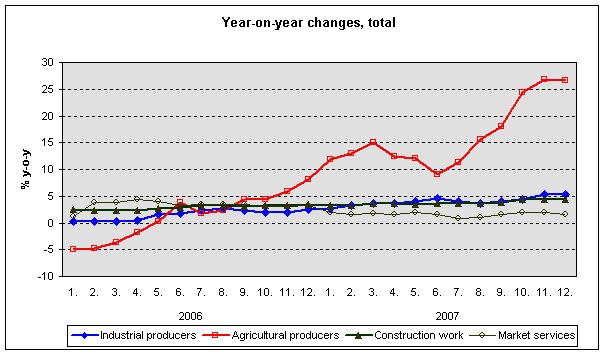 Producer prices in 2007 were characterised by a high growth in all groups of products. Agricultural producer prices on average were the highest from the start of the observation in 1992. Industrial producer prices reached the highest level in last three years, construction prices in last six years.
