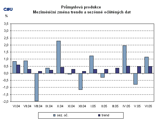 Průmyslová produkce sezónně očištěná byla meziměsíčně v červnu 2005 vyšší o 1,1 %. Trend meziměsíčně vzrostl o 0,5 % (tabulka č. 5).