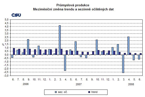 Průmyslová produkce sezónně očištěná byla meziměsíčně v červnu 2008 nižší o 0,7 %. Trend vzrostl o 0,2 % (tabulka č. 6).