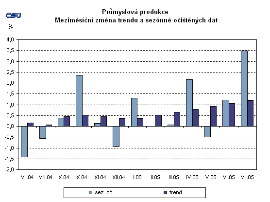 Průmyslová produkce sezónně očištěná byla meziměsíčně v červenci 2005 vyšší o 3,5 %. Trend meziměsíčně vzrostl o 1,2 % (tabulka č. 5).