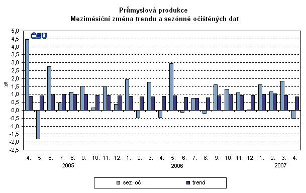 Průmyslová produkce sezónně očištěná byla meziměsíčně v dubnu 2007 nižší o 0,5 %. Trend vzrostl o 0,8 % (tabulka č. 5).