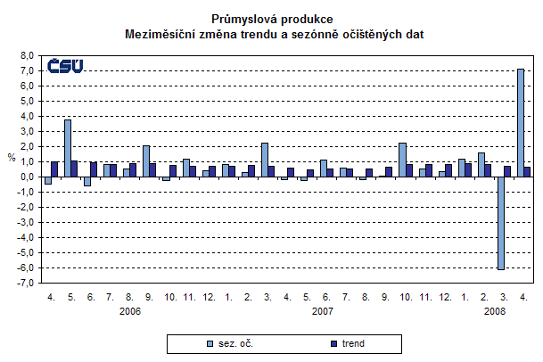 Průmyslová produkce sezónně očištěná byla meziměsíčně v dubnu 2008 vyšší o 7,1 %. Trend vzrostl o 0,7 % (tabulka č. 6).
