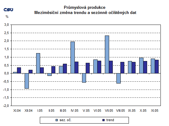 Průmyslová produkce sezónně očištěná byla meziměsíčně v listopadu 2005 vyšší o 0,9 %. Trend vzrostl o 0,8 % (tabulka č. 5).