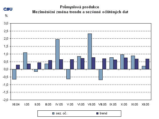 Průmyslová produkce sezónně očištěná byla meziměsíčně v prosinci 2005 vyšší o 0,2 %. Trend vzrostl o 0,7% (tabulka č. 5).