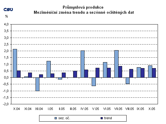 Průmyslová produkce sezónně očištěná byla meziměsíčně v říjnu 2005 vyšší o 0,9 %. Trend meziměsíčně vzrostl o 0,7 % (tabulka č. 5).