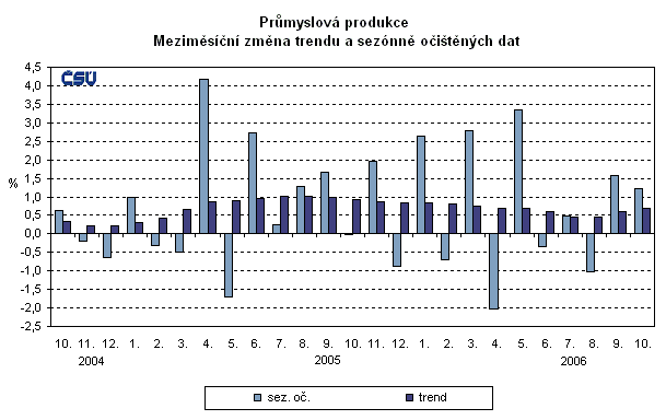 Průmyslová produkce sezónně očištěná byla meziměsíčně v říjnu 2006 vyšší o 1,2 %. Trend vzrostl o 0,7 % (tabulka č. 5).