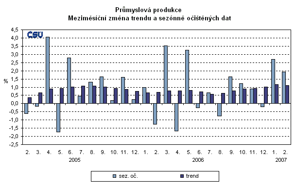 Průmyslová produkce sezónně očištěná byla meziměsíčně v únoru 2007 vyšší o 1,9 %. Trend vzrostl o 1,1 % (tabulka č. 5).