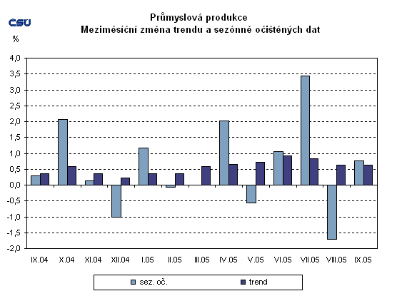 Průmyslová produkce sezónně očištěná byla meziměsíčně v září 2005 vyšší o 0,8 %. Trend meziměsíčně vzrostl o 0,6 % (tabulka č. 5).