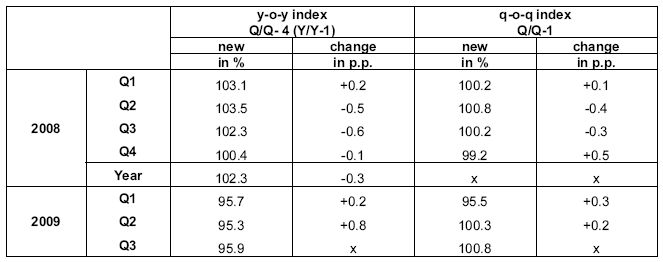 In Q3 2009, GDP adjusted for price, seasonal and working days effects fell by 4.1% in comparison to Q3 2008. By contrast, compared to Q2 2009, GDP increased by 0.8%. Total employment adjusted for seasonal effects dropped by 2.3%, y-o-y, and by 0.3%, q-o-q.