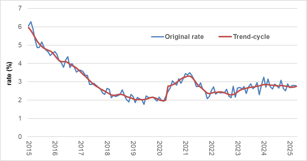 Original (unadjusted) and smoothed (trend-cycle) unemployment rate, 2015–2025