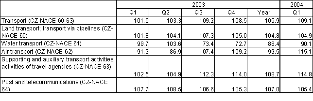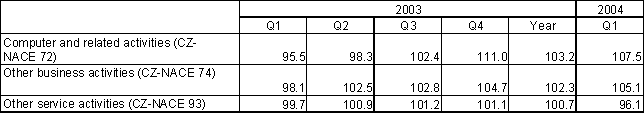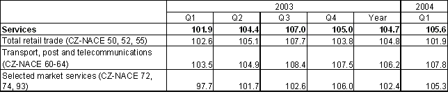 In terms of y-o-y comparison, the development of the three basic branches of services – ‘total retail trade’, ‘transport, post and telecommunications’ and ‘selected market services’ – varied. Compared to the results achieved throughout 2003, the growth rate of sales in total retail trade lowered in Q1 2004. In contrast to this, transport, post and telecommunications maintained their average growth rate of 2003 and selected market services exceeded it considerably.
