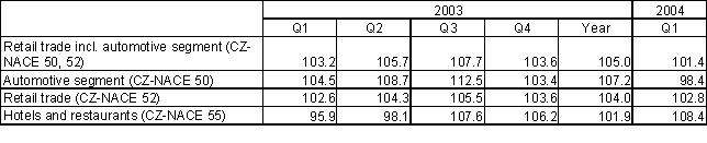 Retail trade incl. automotive segment raised its sales by only 1.4%. The slower growth was predominantly due to the negative development in the automotive segment, where sales decreased by 1.6%. The fall was particularly affected by problems in sale of motor vehicles, especially passenger cars (-4.8%); also maintenance and repair of motor vehicles were down (-6.2%). Sale of automotive fuel rose (+4.5%), but the growth rate slowed markedly down. The contributors to higher sales in retail trade (+2.8%) was higher sale of both food (+2.6%) and non-food goods (+3.0%). From among non-food goods sold in specialised stores, sale of textiles, clothing and footwear grew most (+10.4%), followed by sale of pharmaceutical and medical goods, cosmetic and toilet articles (+5.3%). The higher sales of electronics, furniture and appliances and other household equipment (+5.2%) were mainly affected by development in February and March, when massive advertising took place, resulting in higher purchases (e.g. gardening equipment). Sales of books, newspapers and stationery, sports equipment, musical articles, computers and other non-food goods rose by only 0.8%. Among less important types of sale, sale via mail order houses reduced by 7.2% in Q1 2004 (as against a rise of 18.6% in 2003). Like all the year 2003 round, sale of second-hand goods went down (-9.6%). In hotels and restaurants , there was a change for growing trend already in Q3 2003, with a record increase being reported in Q1 2004 (+8.4%). Sales in hotels rose more (+17.6%) than sales in restaurants. The former benefited from very successful winter season. The highest sale increase was recorded in March, which was related to maximum occupancy rate in some large hotels in connection with congresses, trade fairs and other important events.