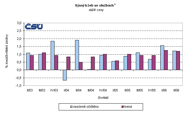 Ve 2. čtvrtletí se sezónně očištěné tržby v odvětví služeb mezičtvrtletně reálně zvýšily o 1,2 %. Trendová složka za stejné období vzrostla rovněž o 1,2 %, což bylo o 0,1 procentního bodu méně než v 1. čtvrtletí (tabulka č. 1).