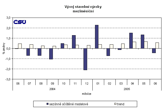 Na základě vykázaných údajů stavební výroba v červnu meziročně vzrostla ve stálých cenách o 19,0 %. Tento růst se dostavil podle očekávání v návaznosti na květnový růst a předchozí vykázané poklesy v březnu a dubnu 2005 ovlivněné přeřazením stavebních prací do kategorie základní sazby DPH (od 1. 5. 2004). Většina stavebních firem vloni přizpůsobila své fakturace tak, aby využila poslední měsíce pětiprocentního zdanění.