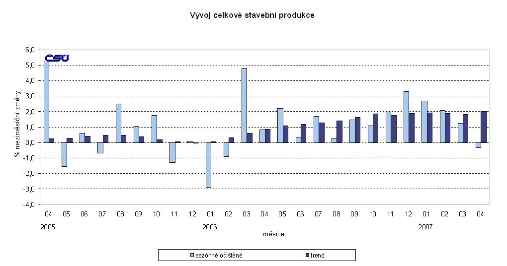 Celková stavební produkce v dubnu meziročně vzrostla ve stálých cenách o 17,6 %, po vyloučení vlivu pracovních dní vzrostla o 15,9 % (v dubnu 2007 byl 1 pracovní den navíc) a očištěná od sezónních vlivů (včetně vlivu počtu pracovních dní) byla vyšší o 19,4 %. Příznivé počasí (průměrná denní teplota byla v dubnu 2007 o 2,2 °C meziročně vyšší), nízká srovnávací základna a neustálá poptávka po stavebních pracích napomohly tomu, že celková stavební produkce již pátý měsíc meziročně roste dvouciferným tempem.