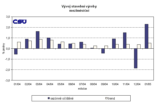 Stavební výroba očištěná od sezónních vlivů byla v lednu meziměsíčně reálně o 2,3 % vyšší. Trend meziměsíčně vzrostl o 0,5 % a tempo jeho růstu mírně zrychlilo (více informací v tabulce č. 3).