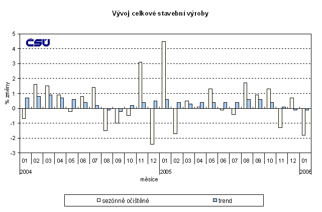 Celková stavební výroba v lednu meziročně klesla ve stálých cenách o 1,2 %, po vyloučení vlivu počtu pracovních dní (v lednu 2006 o 1 pracovní den více) pak o 3,4 % . Pokles stavební výroby ovlivnily nepříznivé klimatické podmínky ledna 2006 (průměrná teplota byla o 3,3 °C nižší proti dlouhodobému normálu), nižší objemy odpracované doby u manuálně pracujících (o 8,3 hodin méně než v lednu 2005) a vysoká srovnávací základna ledna 2005 ( +14,2% ).
