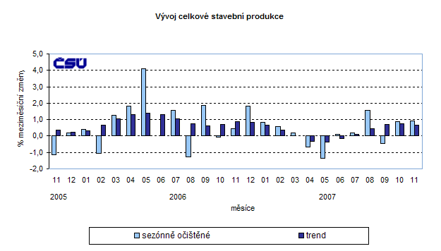 Celková stavební produkce v listopadu meziročně vzrostla ve stálých cenách o 7,0 %, po vyloučení vlivu pracovních dní vzrostla o 5,4 % (v listopadu 2007 bylo o 1 pracovní den více). Stavební produkce vzrostla ve všech sledovaných směrech výstavby kromě ostatních prací. V listopadu výrazně vzrostla produkce inženýrského stavitelství, zejména na opravách, modernizacích a rekonstrukcích silnic, což souviselo především s uvolněním finančních prostředků na tyto práce, zejména pro municipální sektor.