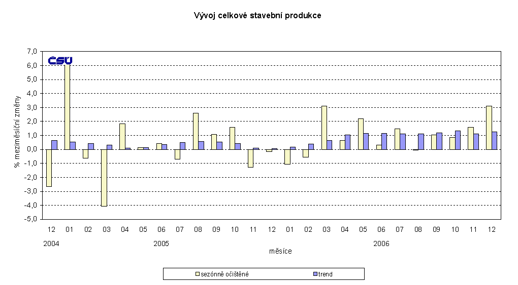 Celková stavební produkce očištěná od sezónních vlivů byla v prosinci meziměsíčně reálně o 3,1 % vyšší. Trend meziměsíčně vzrostl o 1,2 % (viz. tabulka č. 3).