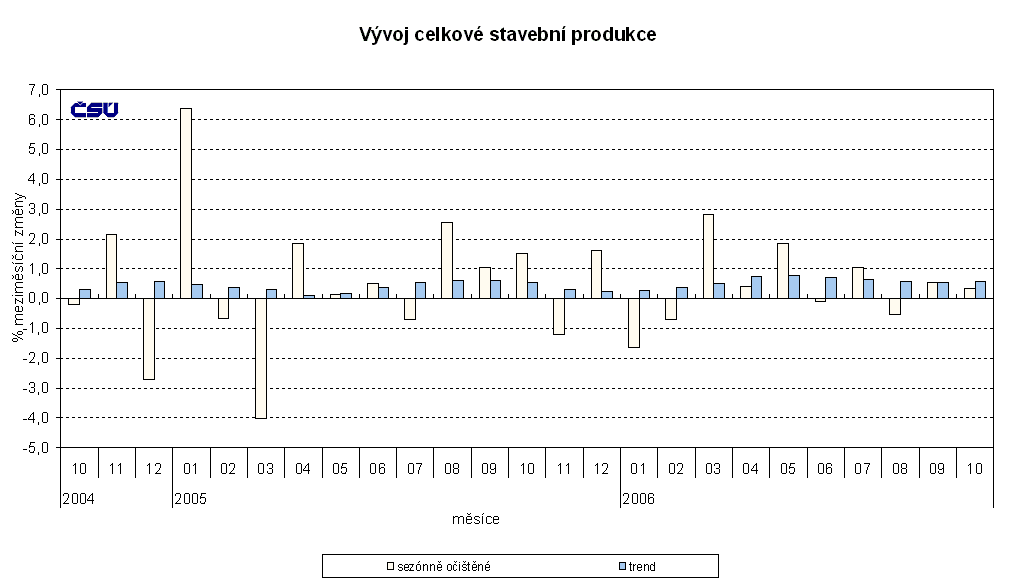 Celková stavební produkce očištěná od sezónních vlivů byla v říjnu meziměsíčně reálně o 0,3 % vyšší. Trend meziměsíčně vzrostl o 0,6 % (viz. tabulka č. 3).