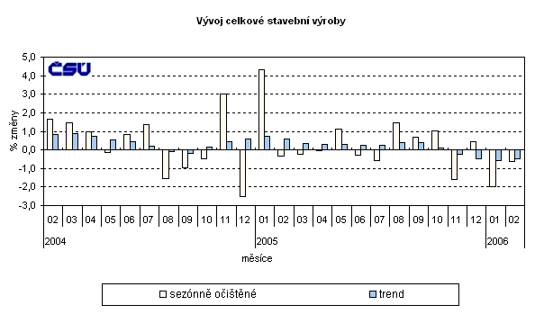 Celková stavební výroba očištěná od sezónních vlivů byla v únoru meziměsíčně reálně o 0,6 % nižší. Meziročně celková stavební výroba klesla ve stálých cenách o 8,2 %. Stavební úřady vydaly 7 577 stavebních povolení, kterých bylo o 5,9 % méně než v únoru 2005.