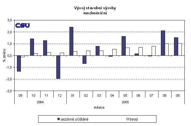 Stavební výroba očištěná od sezónních vlivů byla v září meziměsíčně reálně o 1,5 % vyšší. Trend meziměsíčně vzrostl o 1,0 % (viz. tabulka č. 3). Vývoj trendové složky naznačuje, že stavebnictví v průběhu roku 2005 urychlovalo růst.