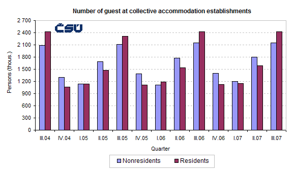 In Q3 2007, overnight stays of guests, which is for the economy of accommodation establishments more important than the number of guests, reached 15.4 million; this was 5.7% down on Q3 2006. The number of overnight stays of foreigners went down by 2.8% and overnight stays of foreigners decreased by 7.8%. An average number of overnight stays of residents decreased from 3.6 to 3.4 days.