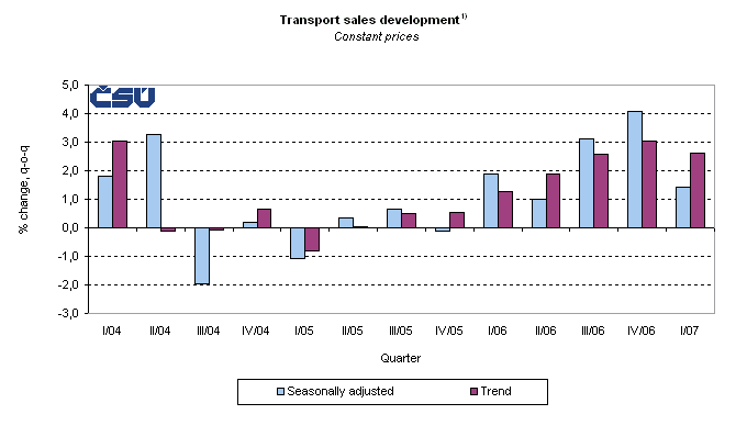 Seasonally adjusted sales in 'transport' increased quarter-on-quarter by 1.4% at constant prices. The trend component grew for the corresponding period by 2.6 %, which was more than average growth in 2006 (Table 1).