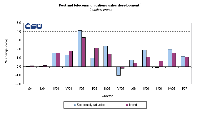 In telecommunications, which contributed to year-on-year growth of not seasonally adjusted sales in 'post and telecommunications' by more than 85%, the growth was 4.5%. Although its dynamics in Q1 was higher than the average for the year 2006, it dropped by 5% behind 2005, which was mainly due to satiation and consolidation of telecommunications market. Postal services after stagnation reported mainly for the latter half of 2004 and in 2005 showed in the observed period a continuing growth since Q1 2006 (by 7.4%).