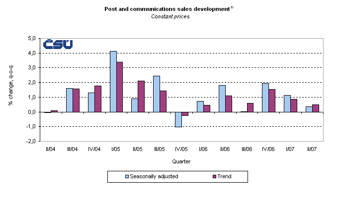 More than a 3/4 share in the year-on-year growth of not seasonally adjusted sales in 'post and telecommunications' was attributed to 'telecommunications' (growth by 3.1%). Their growth remained roughly on the level of average growth in the last four quarters or the whole year 2006, however, it fell behind the 2005 level by more than 6 p.p. From the aspect of size structure the enterprises with up to 100 employees reached better results while the biggest growth was recorded for the groups of enterprises with 50 up to 99 employees. The growth of sales in 'post and courier activities' started in Q1 2006 continued (by 8.7%) especially due to the activities developed by businesses competing with the state post.