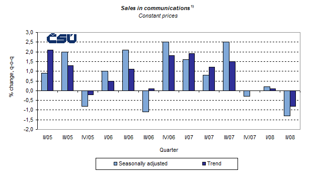 In Q2 2008, seasonally adjusted sales in transport dropped, quarter-on-quarter, by 0.1% at constant prices, and, in the year-on-year comparison, seasonally adjusted and not seasonally adjusted sales increased both by 0.5%. The total growth came mainly from 'supporting and auxiliary transport activities'. In communications seasonally adjusted sales dropped by 1.3%, quarter-on-quarter, and increased by 1.1%, year-on-year, not adjusted by 0.9%.