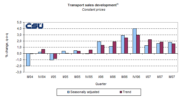 Compared especially with Q1 2007 a slow-down was recorded for 'other land transport' which might be due to a slow-down in construction. Although, the dynamics of growth slowed down already in May and June only the sales drop (-2.7%) occurring in September caused that the growth in Q3 2007 was the lowest in 2007 (2.1%). A significant growth was recorded for sales in 'air transport' (+11.6%) as well as for sales in 'inland water transport' where in summer months favourable sailing conditions (growth by 20.5%) were reported. Conversely, 'transport via railways' reported the most dramatic drop for the last seven quarters (by 1.6%) especially due the development in freight transport.