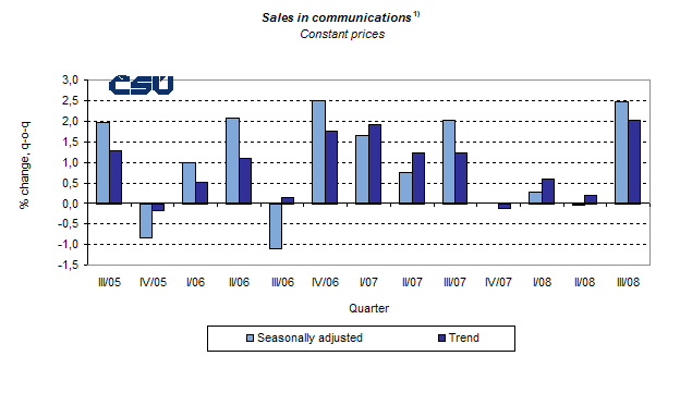 The total growth was contributed to by 'telecommunications' which is one of a few branches where a continuous growth was recorded from the beginning of statistical data collection, i.e. from 1997. In contrast, 'post and courier activities' after two successful years (2006 and 2007) the development resembled the year 2005 when all quarters showed a drop of sales. This was partly due to a marked price increase in services (e.g. sales at current prices in Q3 increased by 10.9%, at constant prices they dropped by 5.1%.