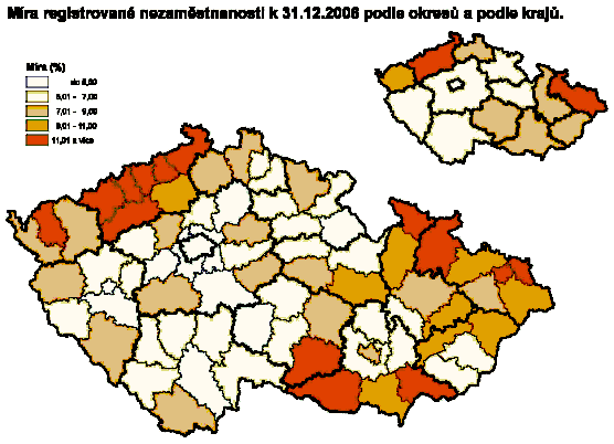 Regionální struktura. Není mnoho případů, kdy by regionální struktura (regionální disparity) tak významně ovlivňovaly agregátní veličiny, jako v případě trhu práce - a nezaměstnanosti. To názorně dokumentuje kartogram o registrované nezaměstnanosti na další straně.
