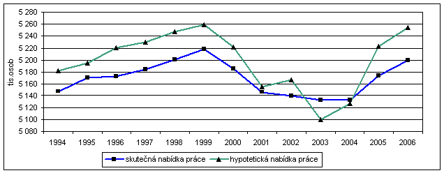 Graf č.4 Skutečná nabídka práce a hypotetická nabídka práce