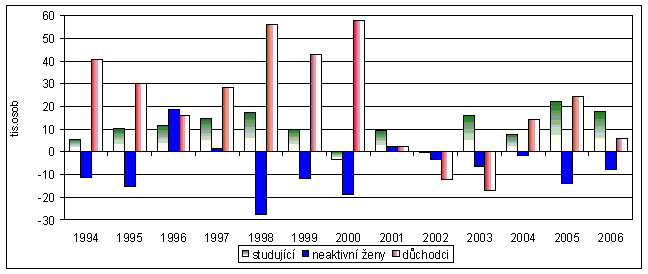 Jiným, neméně významným faktorem modifikujícím nabídku na trhu práce je dobrovolná neaktivita žen. Samozřejmě, že se tento faktor netýká pouze nastupujících ročníků, ba co víc je znám posun v tzv. specifické plodnosti žen 3 . Kromě toho je významnější než mateřská dovolená další péče o rodinu či nespecifikované setrvání žen v domácnosti. Nicméně ženy „neaktivní“ z těchto důvodů jsou interpretovány jako další sociální faktor modifikující pouze demograficky determinovanou nabídku pracovní síly. Opět nás ovšem analyticky zajímají meziroční změny této sociální skupiny (zMD), které jsou řádově shodné se změnami počtu vysokoškoláků. V letech 1999 – 2004 oba faktory nabídku na trhu práce dokonce zvyšovaly.