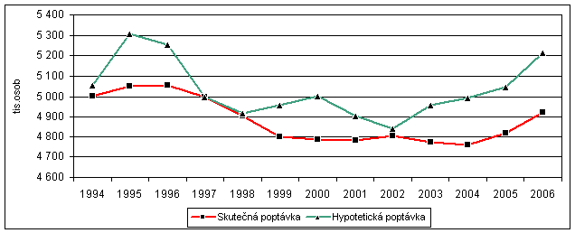 Vývoj poptávky - stejně jako nabídky - není homogenní. Lze konstatovat, že poptávka (P*) jako funkce HDP by - po výkyvu v polovině devadesátých let - rostla. Naopak křivka skutečné poptávky (P) je hladší, přičemž po roce 1996 prudce klesala, a od roku 1999 prakticky stagnuje; ekonomika ani při růstu HDP nevytvářela nová pracovní místa. Se zpožděním, po roce 2004, však i v tomto ohledu dochází ke zlomu: poptávka – zahrnující i počty volných míst – se začala zvedat, přesto nedosáhla úrovně před deseti lety.