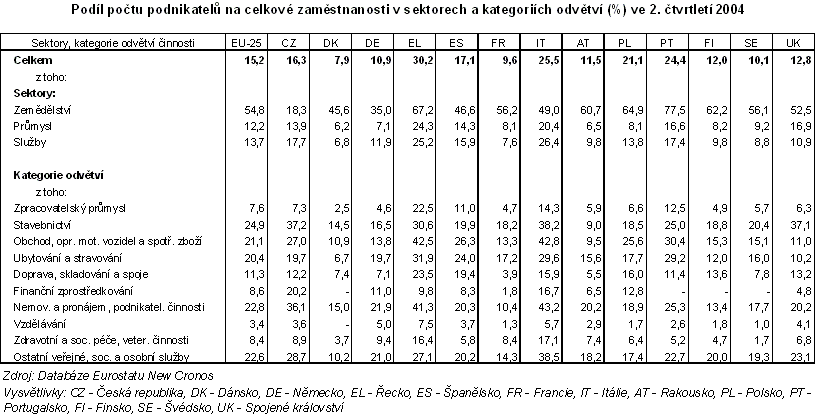 Z údajů Eurostatu vyplývá, že přes pokles počtu podnikatelů , zůstává jejich podíl na celkové zaměstnanosti v ČR v porovnání s ostatními členskými zeměmi EU a Norska nadprůměrný . Význam podnikatelské sféry lze demonstrovat na podílu počtu podnikatelů bez i se zaměstnanci (s vyloučením pomáhajících rodinných příslušníků) k celkové zaměstnanosti v příslušném sektoru či odvětví v zemích EU. V následující tabulce je uveden podíl těchto podnikatelů na zaměstnanosti v odvětvích podle klasifikace OKEČ, která je plně kompatibilní s mezinárodní klasifikací NACE za úhrn zemí EU a vybrané členské země. Údaje se vztahují k posledním dostupným výsledkům za 2.čtvrtletí 2004.