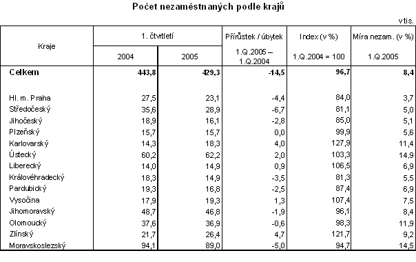 Při růstu celkové zaměstnanosti bydlícího obyvatelstva vzrostl i počet ekonomicky neaktivních osob a naopak meziročně poklesly počty nezaměstnaných . Počet nezaměstnaných podle metodiky ILO dosáhl v průměru za 1. čtvrtletí letošního roku 429,3 tis. a proti stejnému čtvrtletí roku 2004 se snížil o 14,5 tis. Nezaměstnanost vzrostla v krajních skupinách produktivního věku, ve věku 15-19let o 0,9 tis. a ve věku 60-64let o 1,7 tis. Přestože počet nezaměstnaných mužů (celkem 212,3 tis.) je stále nižší než počet nezaměstnaných žen (217,0 tis.), je zřejmá protichůdná tendence ve vývoji četnosti těchto skupin nezaměstnaných. Při celkovém meziročním poklesu nezaměstnanosti se nezaměstnanost mužů zvýšila o 1,5 tis. a růst počtu nezaměstnaných mužů se nejvíce projevil ve skupině 15-19letých (o 4,3 tis.). Počet nezaměstnaných žen se ve stejném období snížil celkem o 15,9 tis. a tento pokles se projevil v převážné části intervalu produktivního věku.