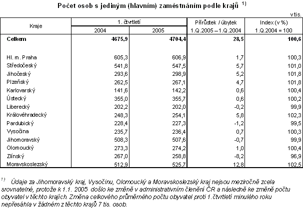 Zaměstnanost osob bydlících na území jednotlivých regionů se meziročně snížila ve čtyřech krajích republiky, absolutně nejvíce ve Zlínském a v Pardubickém kraji. Počet pracujících se naopak nejvíce zvýšil v Moravskoslezském kraji, který trpí chronicky vysokou nezaměstnaností, v Královéhradeckém a Středočeském kraji.