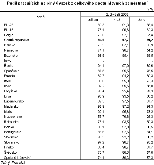 Podíl pracujících na plnou pracovní dobu v hlavním zaměstnání je v ČR třetí nejvyšší ze všech členských zemí EU. Zastoupení plných úvazků je sice vyšší na Slovensku a v Maďarsku, celková míra zaměstnanosti je však na Slovensku a v Maďarsku podprůměrná. Podíl mužů pracujících v ČR na plný úvazek byl ve 2. čtvrtletí minulého roku druhý nejvyšší z EU25, u žen to byl čtvrtý nejvyšší podíl.