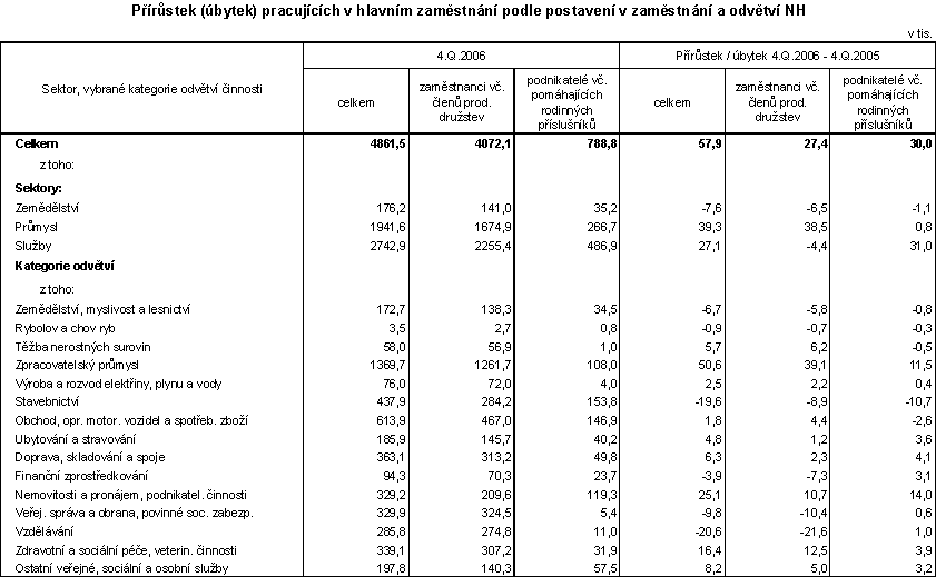 Zaměstnanost v primárním sektoru (zemědělství, lesnictví, chov ryb) meziročně klesla o 7,6 tis. na 176,2 tis. osob a činila pouze 3,6 % celkového počtu osob s jediným nebo hlavním zaměstnáním. Počet pracujících v sekundárním sektoru (průmysl, stavebnictví) se zvýšil proti 4. čtvrtletí 2005 o 39,3 tis. na 1 941,6 tis., tj. 39,9 % celkové zaměstnanosti. Tento nárůst byl ovlivněn především meziročním zvýšením zaměstnanosti ve zpracovatelském průmyslu o 50,6 tis. Nejvíce vzrostl počet pracujících ve skupině výroba dílů a příslušenství pro motorová vozidla (kromě motocyklů) a jejich motory (o 27,2 tis.), povrchová úprava a zušlechťování kovů, všeobecné strojírenské činnosti (9,7 tis.), výroba plastových výrobků (8,5 tis.) a výroba elektronek a jiných elektronických součástek (7,2 tis.). Pokles zaměstnanosti ve stavebnictví o 19,6 tis. se nejvíce projevil v dokončovacích stavebních činnostech a v pozemním a inženýrském stavitelství. 1 )