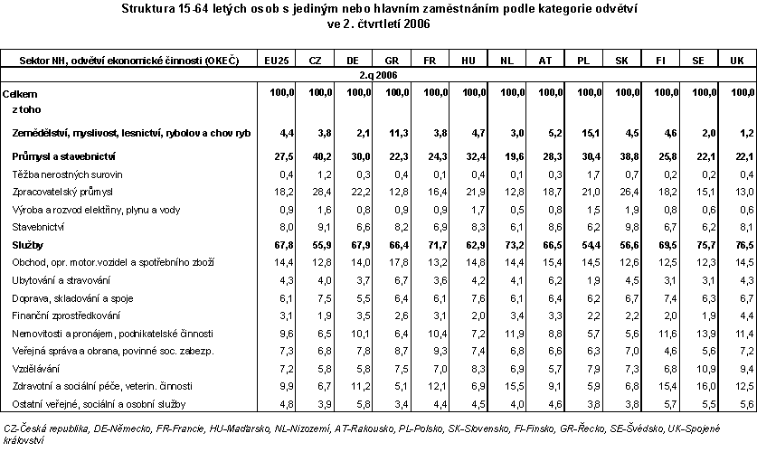 Pro ekonomiku ČR je typický vysoký podíl zaměstnanosti v sekundárním sektoru (průmysl + stavebnictví). Tento podíl je nejvyšší ze všech zemí EU25 a přibližuje se mu pouze podíl tohoto sektoru na celkové zaměstnanosti na Slovensku. Obdobně je tomu u kategorie zpracovatelského průmyslu, když jeho podíl v ČR dosáhl ve 2. čtvrtletí 2006 28,4 % celkové zaměstnanosti. To je nejvyšší hodnota ze všech zemí EU a ČR tak předstihla i Slovinsko. V naší republice byl podíl zpracovatelského průmyslu přibližně o 10 % bodů vyšší než v EU25 a o 11 bodů vyšší než v EU15. Na druhé straně se naše odvětvová skladba zaměstnanosti vyznačuje podstatně nižším zastoupením sektoru služeb, než je tomu v EU15 (-13 % bodů), ale také v EU25 (-12 % bodů). Podprůměrně je zastoupena zejména kategorie nemovitosti a pronájem, podnikatelské činnosti a kategorie zdravotní a sociální péče. V následující tabulce jsou uvedeny údaje o odvětvové skladbě za vybrané země EU ve 2. čtvrtletí 2006, za které Eurostat publikoval poslední kompletní výsledky.