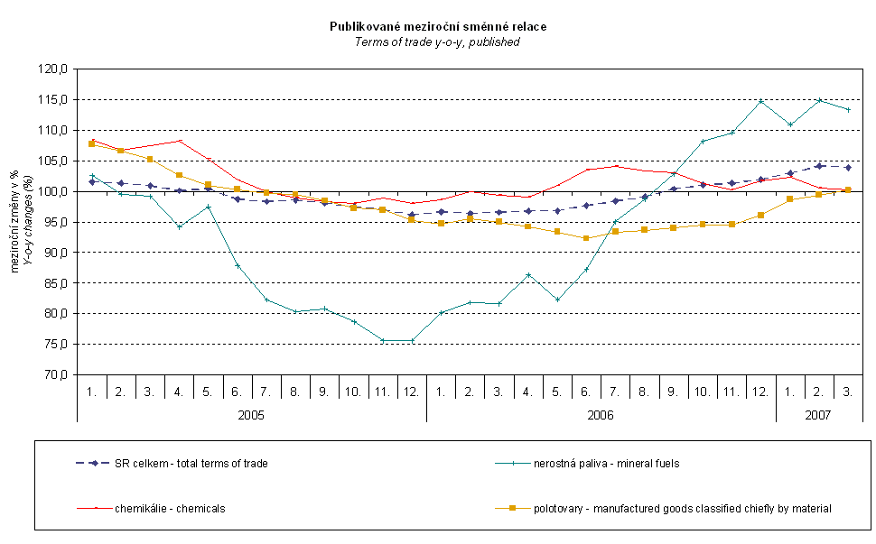 Meziročně dosáhly směnné relace v 1. čtvrtletí 2007 pozitivní hodnoty 103,7 % (tedy o 2,3 p.b. více než ve 4. čtvrtletí 2006) – meziroční směnné relace rostly čtvrtletně od 2. čtvrtletí roku 2006 – viz graf níže. Nejvyšší hodnota byla ve skupině ostatní suroviny – 116,4 %, ve skupině stroje a dopravní prostředky pak 104,2 % (ve 4. čtvrtletí 2006 102,3 %). Negativní hodnota směnných relací byla z významnějších skupin pouze u polotovarů – 99,4 %.