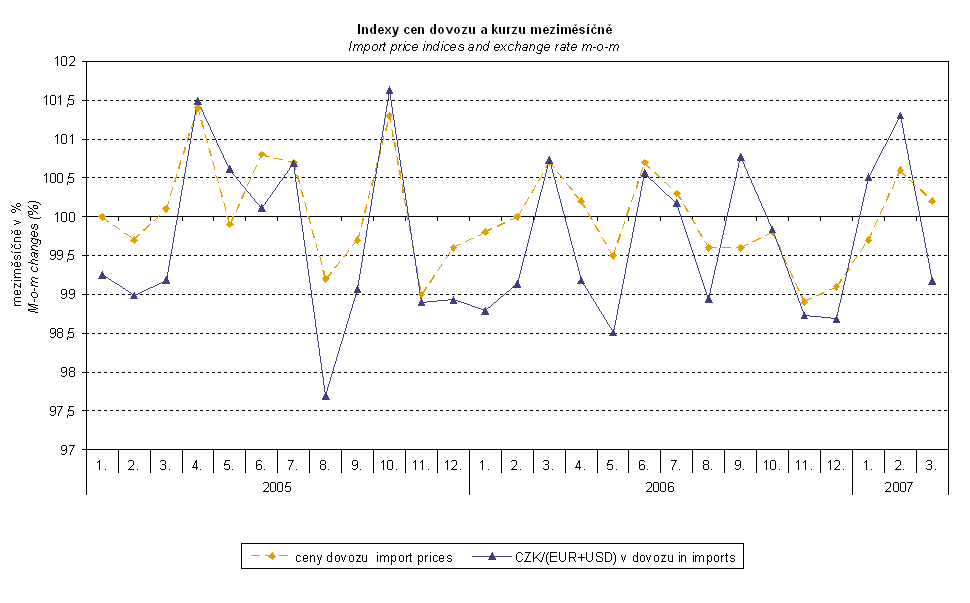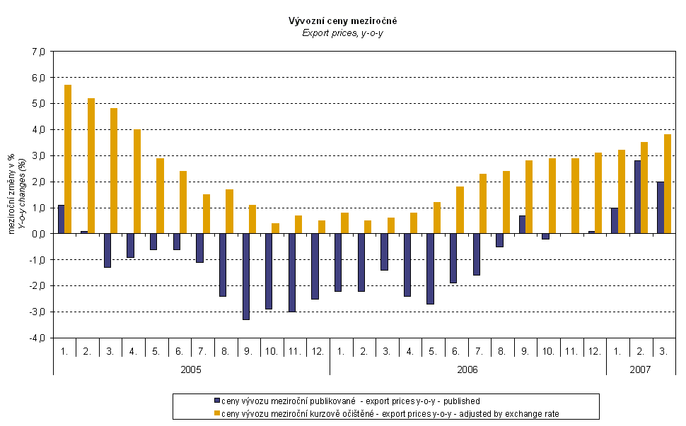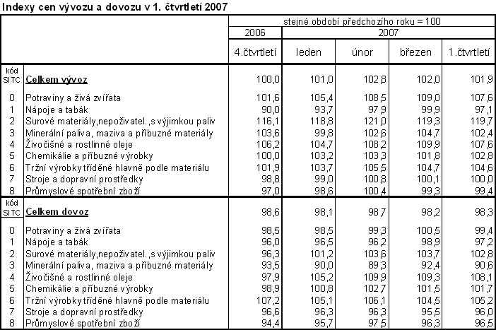 Ceny vývozu se v průměru v 1. čtvrtletí 2007 zvyšovaly meziměsíčně o 0,7 % (ve 4. čtvrtletí 2006 se snižovaly o 0,4 %). Ceny dovozu se v průměru v 1. čtvrtletí zvyšovaly meziměsíčně o 0,2 % (ve 4. čtvrtletí 2006 se naopak snižovaly o 0,7 %).