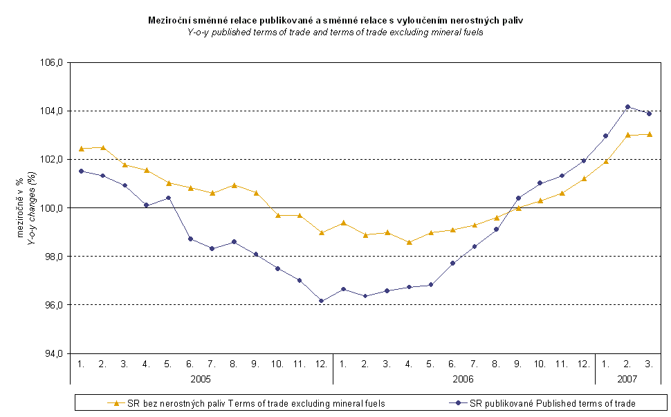 Jaké jsou další příčiny postupného růstu meziročních směnných relací od března roku 2006 (s výjimkou posledního analyzovaného měsíce – tedy března roku 2007)? Ve výše uvedeném grafu jsou skupiny s nejvýraznějším vývojem směnných relací od roku 2005. Jsou to jednak polotovary (hlavně kovy a kovové výrobky), ale především pak nerostná paliva a s nimi související chemikálie (zejména organické). Tedy skupiny, u kterých došlo v tomto období k nejvýraznějším cenovým turbulencím. Jak by se vyvíjela hodnota směnných relací, pokud by ze sledování byla vyloučena skupina nerostných paliv?